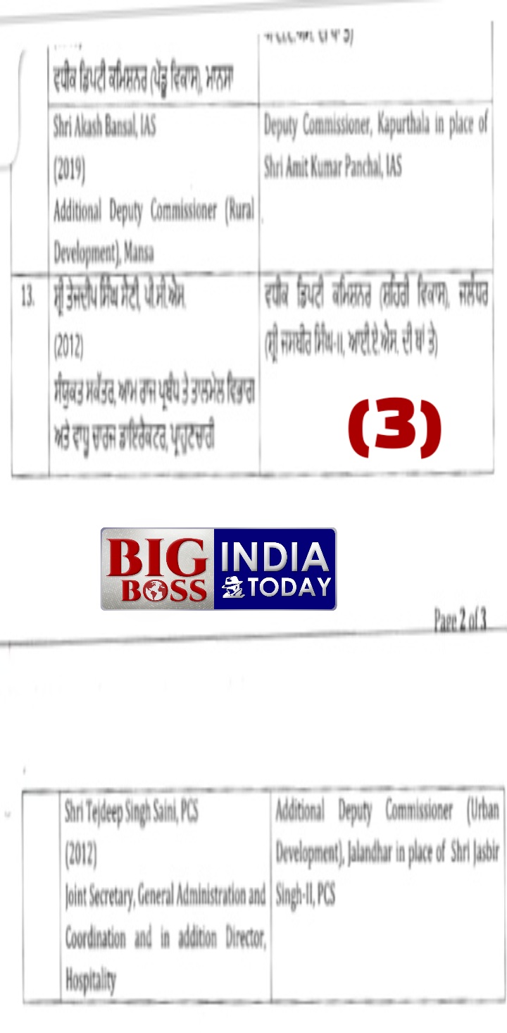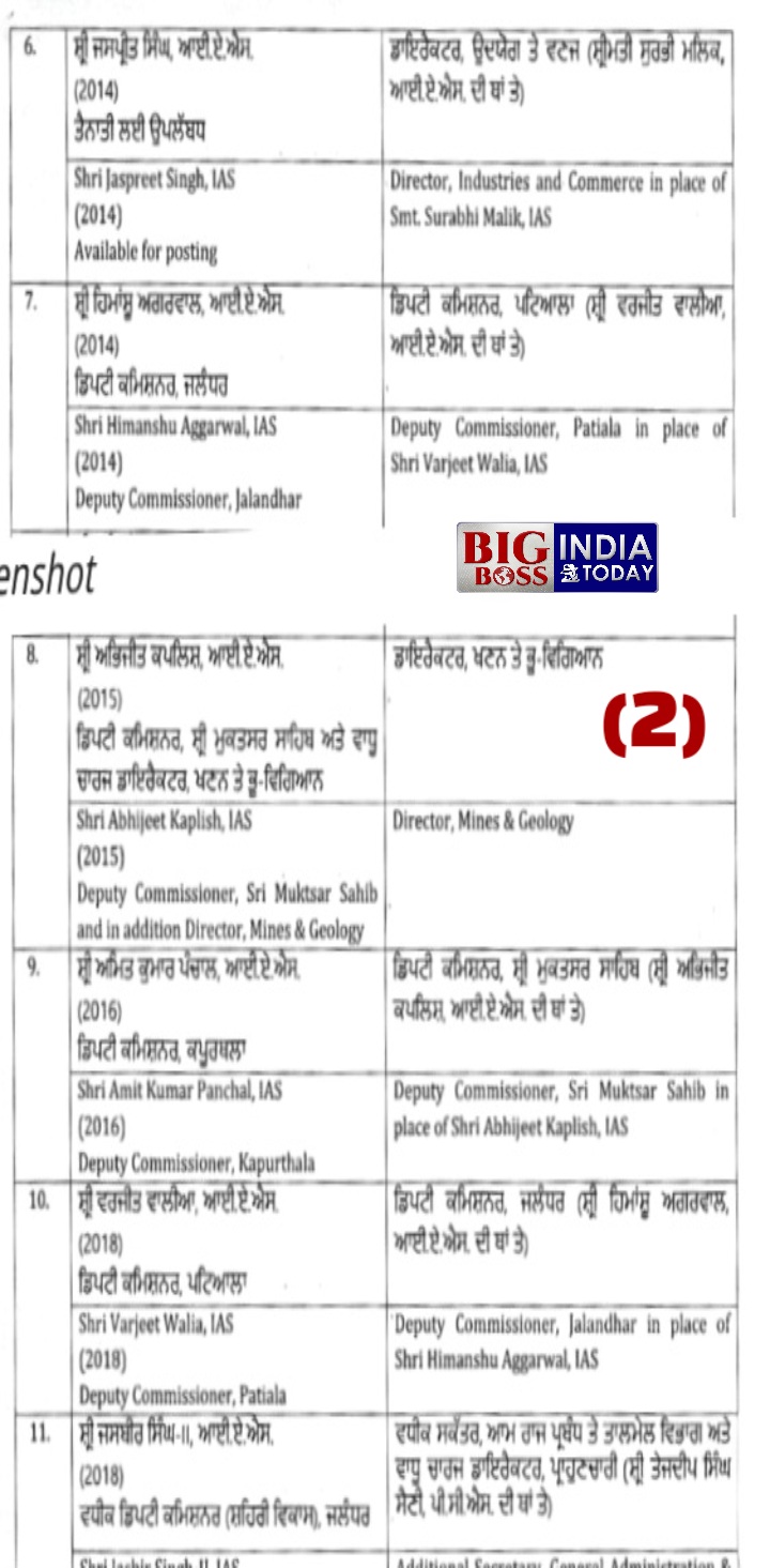 पंजाब सरकार ने 13 आई ए एस का तबादला कर दिया है। जिनमें 4 जिलों के डिप्टी कमीश्नर भी बदले गये है और इन्हें तुरन्त प्रभाव से लागू किया गया है। अब जालन्धर के डिप्टी कमीश्नर वरजीत वालिया आई ए एस होंगे, वह डा॰ हिमांशु अग्रवाल का स्थान लेंगे। जबकि डा॰ हिमांशु अग्रवाल को वरजीत वालिया की जगह पटियाला का डिप्ट कमीश्नर लगाया गया है।