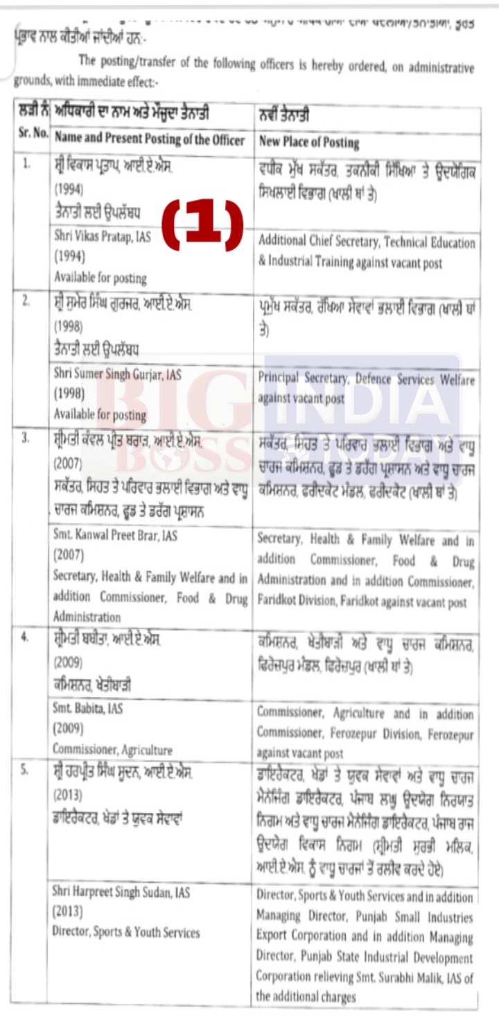 पंजाब सरकार ने 13 आई ए एस का किया तबादला - 4 जिलों के डिप्ट कमीश्नर बदले